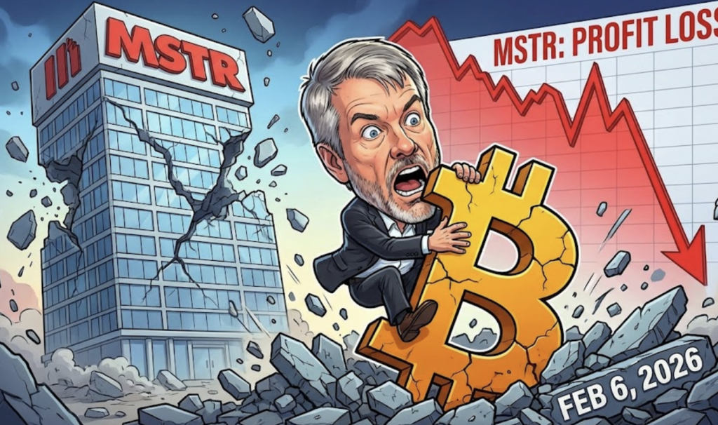 마이크로스트래티지 MSTR 건물 붕괴와 비트코인을 붙잡고 절규하는 마이클 세일러 풍자 이미지
